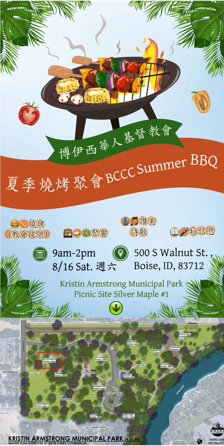 博伊西教会夏季烧烤聚会即将在8月16日周六 早上9 点 到 下午2点